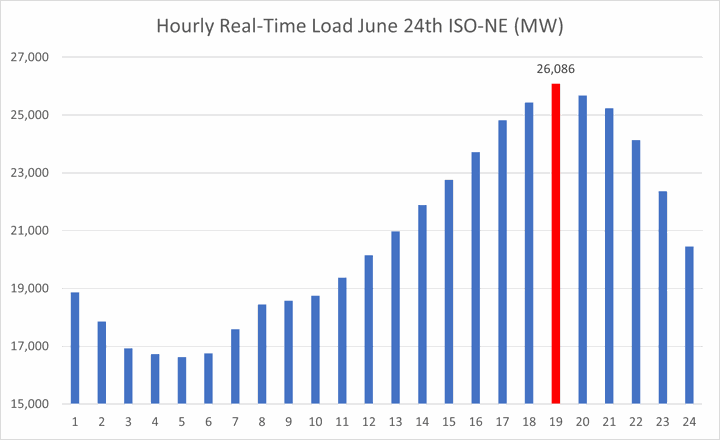 The following chart shows hourly loads for June 24. The 6:00 PM to 7:00 PM hour (Hour 19) is the clear winner at just over 26,000 MW with the 7:00 PM to 8:00 PM hour (Hour 20) around 200 MW lower.